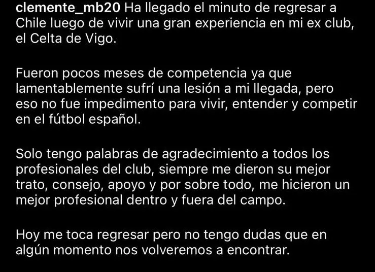 “Ha llegado el minuto de regresar a Chile luego de vivir una gran experiencia en mi ex club, el Celta de Vigo. Fueron pocos meses de competencia ya que lamentablemente sufrí una lesión a mi llegada, pero eso no fue impedimento para vivir, entender y competir en el fútbol español”, partió señalando Montes.