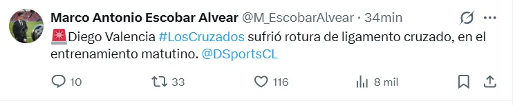 Así lo confirmó el reportero de la UC para DSports, Marco Escobar, quien a través de su cuenta de X publicó que: “Diego Valencia sufrió rotura de ligamento cruzado, en el entrenamiento matutino”.