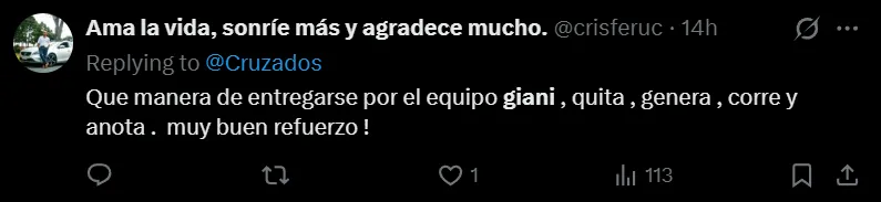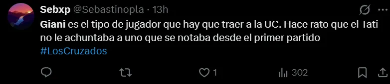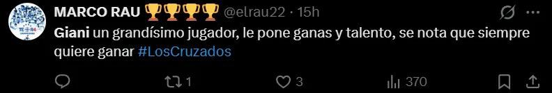 La gran figura del partido, fue Fernando Zampedri, quien aportó con un gol y una asistencia. Pero otro que se llenó de aplausos y que tiene enamorados a los hinchas cruzados, fue el autor del segundo gol, Justo Giani.