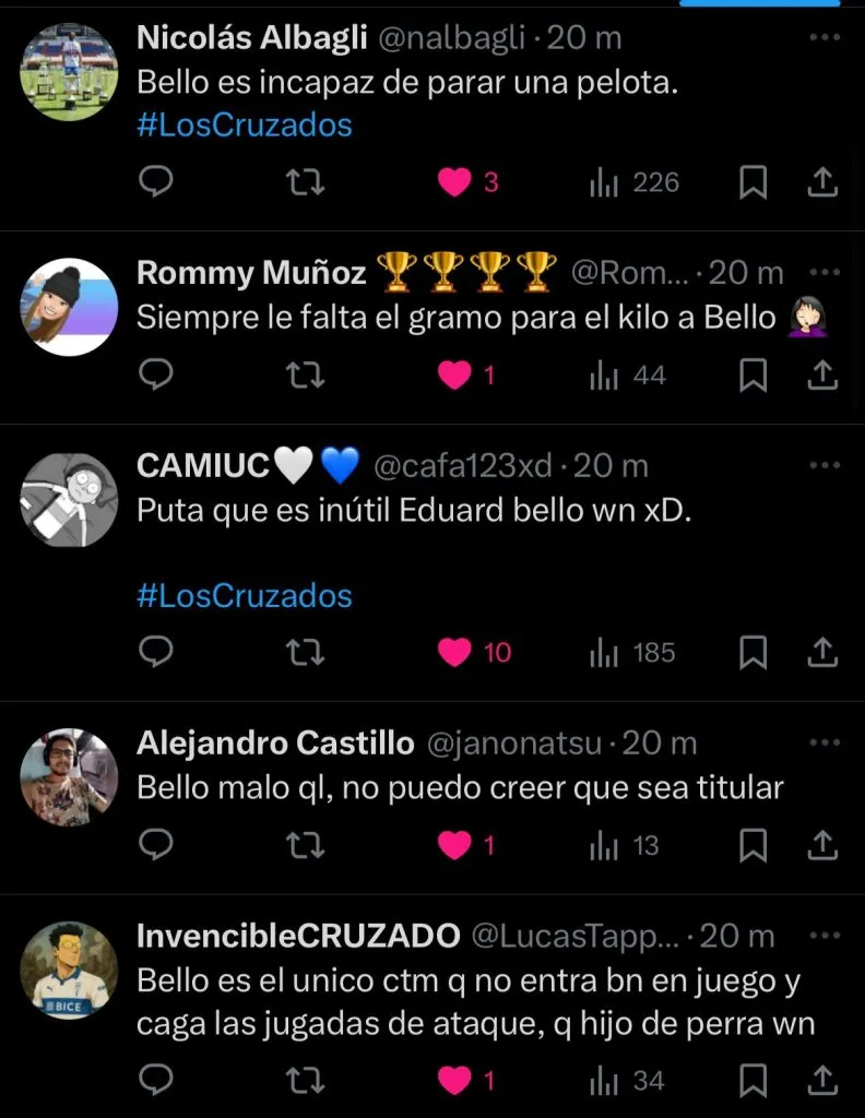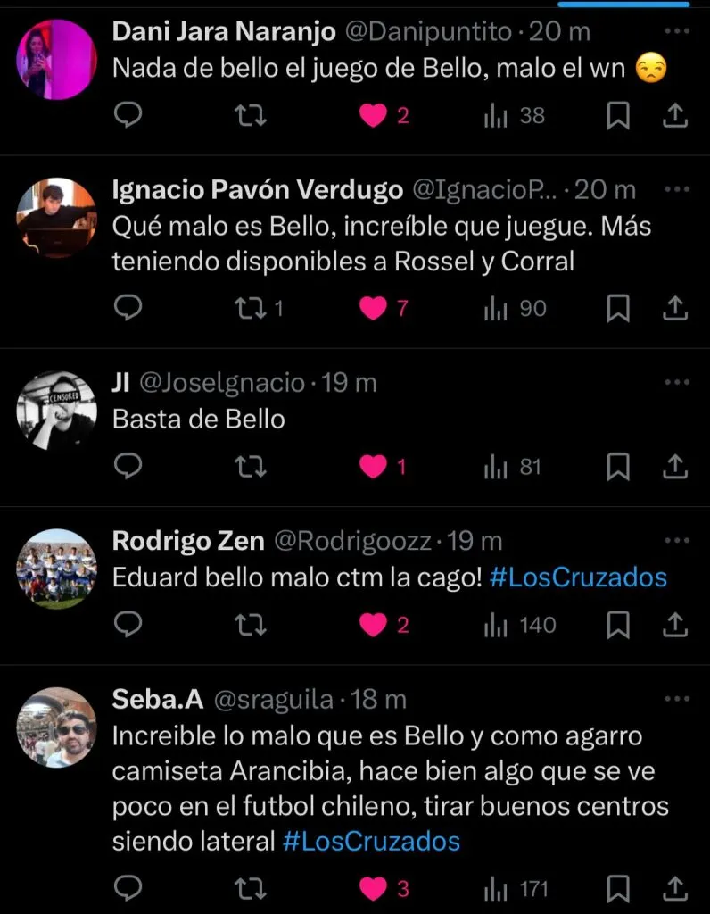 “Que malo es Bello, increíble que juegue. Más teniendo disponibles a Rossel y Corral”, dijo uno de los hinchas de la UC