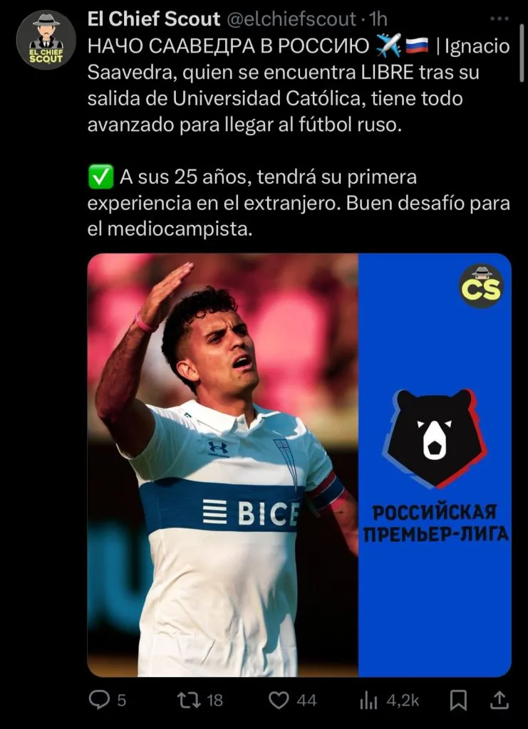 “Ignacio Saavedra, quien se encuentra libre tras su salida de Universidad Católica, tiene todo avanzado para llegar al fútbol ruso. A sus 25 años, tendrá su primera experiencia en el extranjero. Buen desafío para el mediocampista”, explicó el sitio citado.