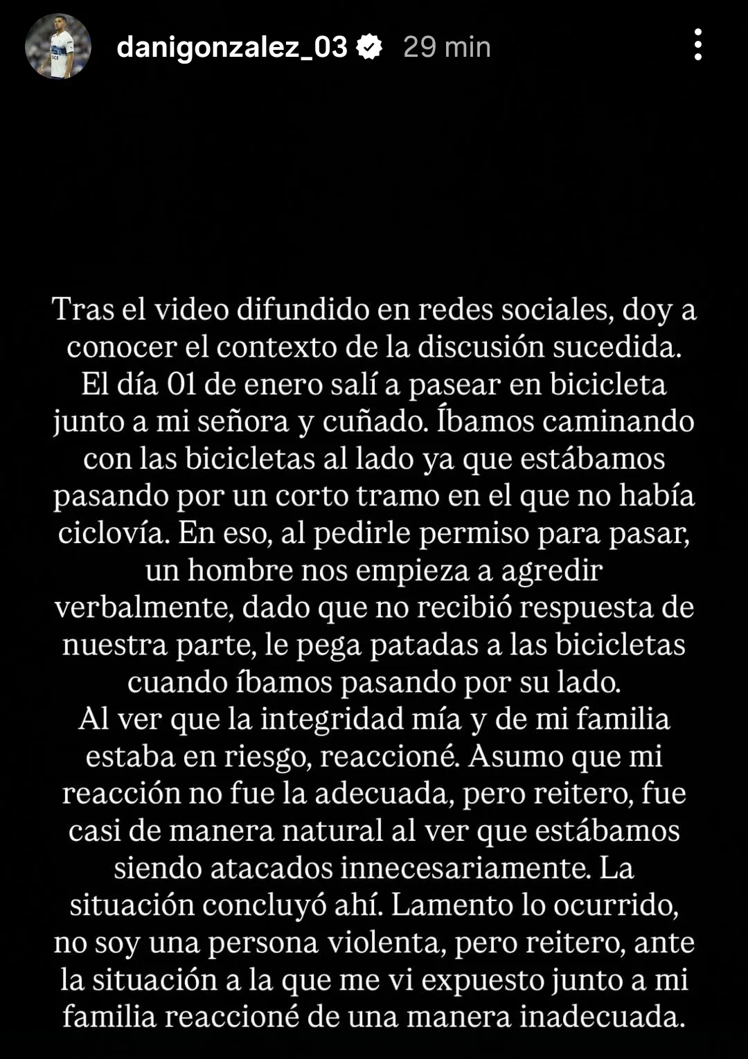 “Tras el video difundido en redes sociales, doy a conocer el contexto de la discusión sucedida. El día 01 de enero salí a pasear en bicicleta junto a mi señora y cuñado. Íbamos caminando con las bicicletas al lado ya que estábamos pasando por un corto tramo en el que no había ciclovía”, señaló González de entrada.