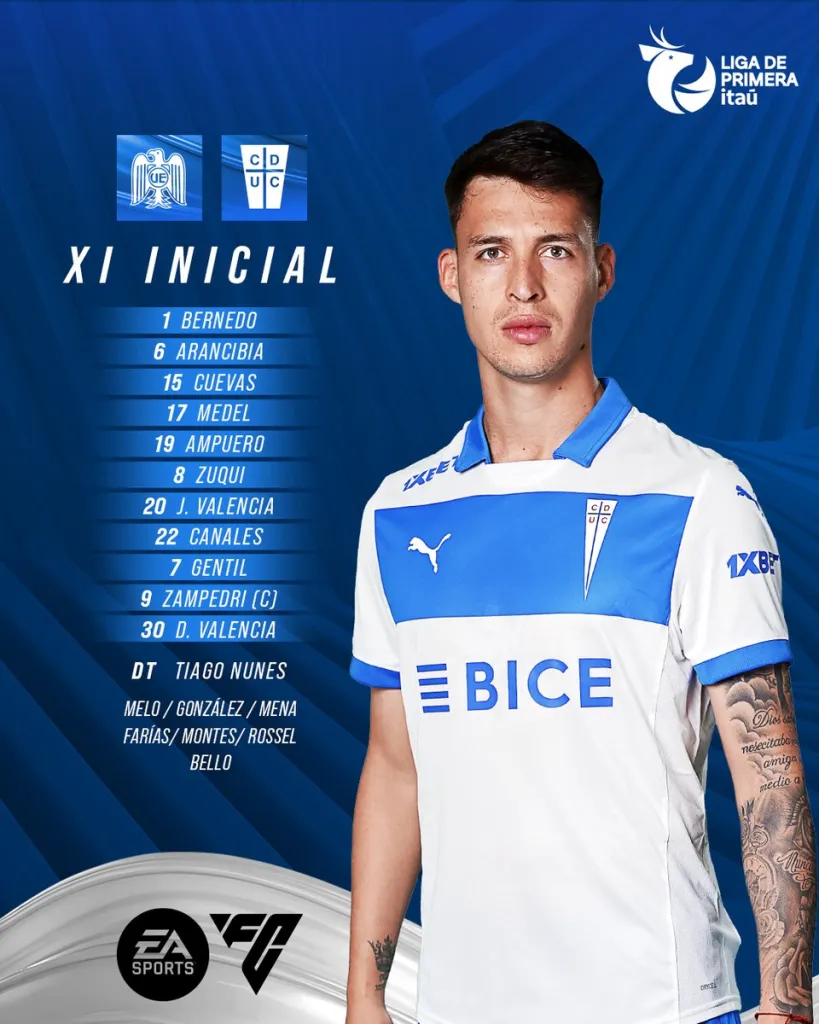 La formación de la UC es con Vicente Bernedo en el arco; Sebastián Arancibia, Gary Medel, Branco Ampuero y Cristián Cuevas en zona defensiva; Alfred Canales, Fernando Zuqui, Jhojan Valencia en mediocampo; Jader Gentil, Fernando Zampedri y Diego Valencia en delantera.