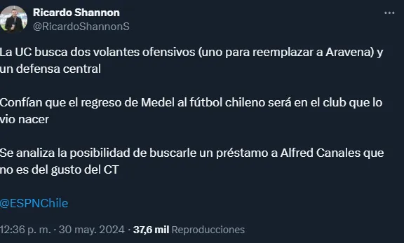 “La UC busca dos volantes ofensivos (uno para reemplazar a Aravena) y un defensa central”, fue lo que señaló el periodista en su cuenta de ‘X’.