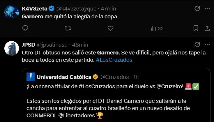 “Por qué Garnero insiste con Valencia ahí”, “hoy varios nos bajaremos del carro de Garnero”, “no sé cómo va a aguantar el mediocampo”, “¿por qué a Garnero le da susto jugar la Copa Libertadores?”, “formación fútbol terrorista by Daniel Garnero”, “me quitó la alegría de la copa”, fueron algunos de los comentarios que lapidaron la decisión del DT Cruzado.