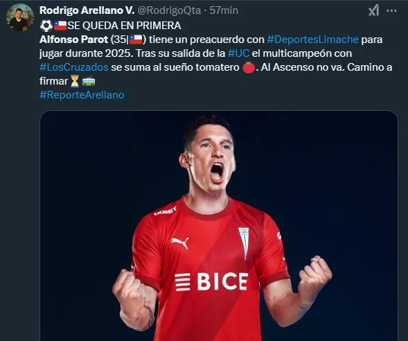 “Se queda en primera. Alfonso Parot tiene un preacuerdo con Deportes Limache para jugar durante el 2025. Tras su salida de la UC, el multicampeón con los cruzados se suma al sueño tomatero. Camino a firmar”, señaló el comunicador.