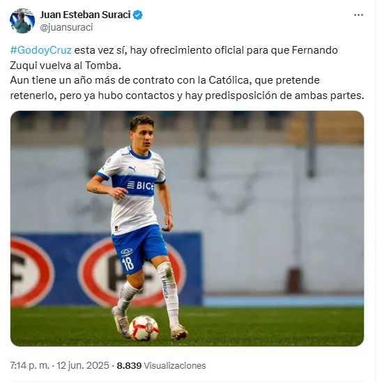 En esta jornada, el periodista Juan Esteban Suraci informó en su cuenta de ‘X’, que el conjunto argentino Godoy Cruz se lanzará con todo para buscar el fichaje del volante de la UC, Fernando Zuqui.