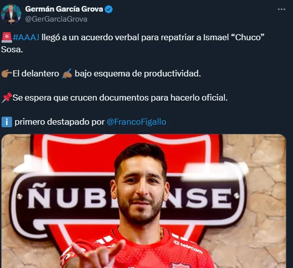 “Argentinos Juniors llegó a un acuerdo verbal para repatriar a Ismael “Chuco” Sosa. El delantero firma bajo esquema de productividad. Se espera que crucen documentos para hacerlo oficial”, informó.