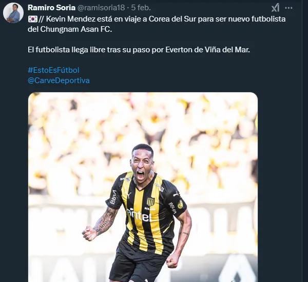 “Kevin Méndez está en viaje a Corea del Sur para ser nuevo futbolista del Chungnam Asan FC. El futbolista llega libre tras su paso por Everton de Viña del Mar”, indicaron.