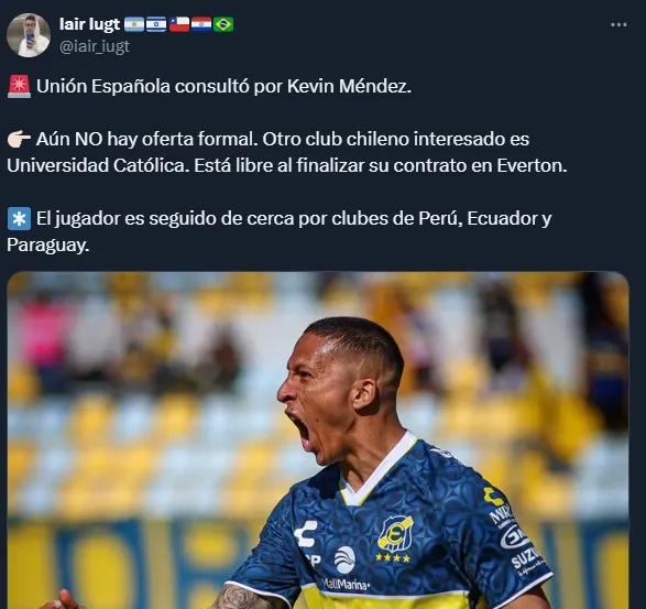 “Unión Española consultó por Kevin Méndez. Aún no hay oferta formal. Otro club chileno interesado es Universidad Católica. Está libre al finalizar su contrato en Everton. El jugador es seguido de cerca por clubes de Perú, Ecuador y Paraguay”, informó.