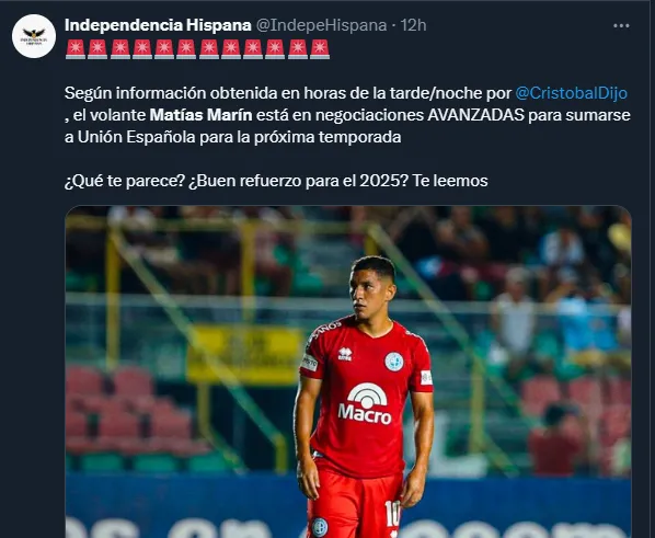 “Según información obtenida en horas de la tarde/noche por Cristóbal de Pablo (periodista) el volante Matías Marín está en negociaciones avanzadas para sumarse a Unión Española para la próxima temporada”, informaron.