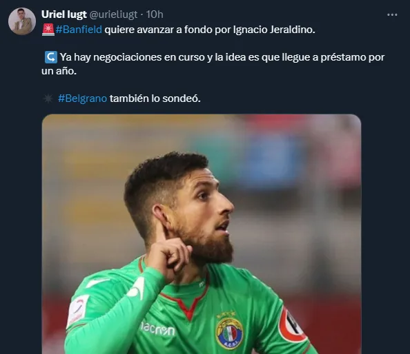 “Banfield quiere avanzar a fondo por Ignacio Jeraldino. Ya hay negociaciones en curso y la idea es que llegue a préstamo por un año. Belgrano también lo sondeó”, declaró.