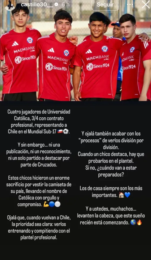 “Cuatro jugadores de la Universidad Católica, tres de ellos con contrato profesional, representando a Chile en el Mundial Sub 17 y, sin embargo, ni una publicación, ni un reconocimiento, ni un solo partido destacado por parte de Cruzados”, escribió Castillo.