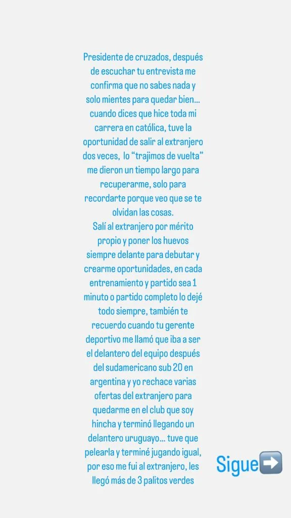 Castillo salió al paso de los dichos del directivo y respondió con todo: “Presidente de Cruzados, después de escuchar tu entrevista me confirma que no sabes nada y solo mientes para quedar bien. Cuando dices que hice toda mi carrera en Católica, tuve la oportunidad de salir al extranjero dos veces”.