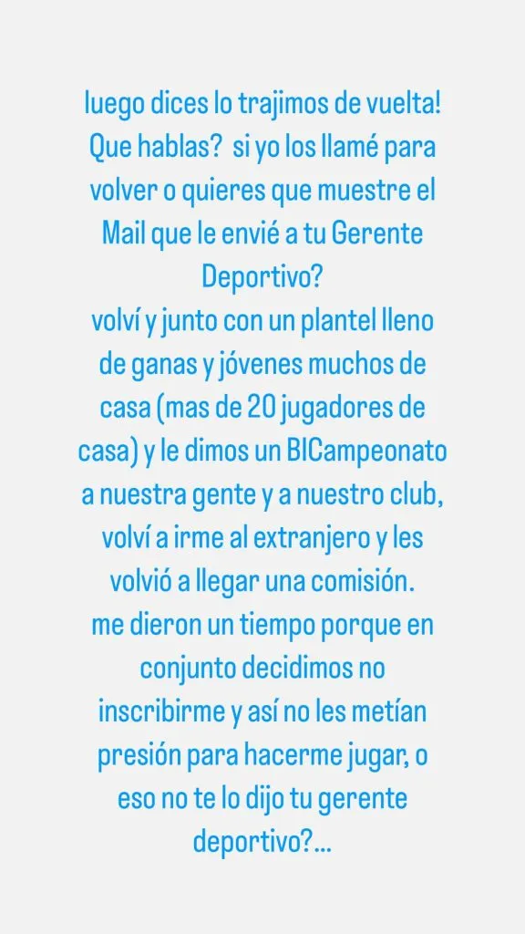 “También te recuerdo cuando tu gerente me llamó que iba a ser el delantero del equipo después del Sudamericano Sub-20 en Argentina y yo rechace varias ofertas en el extranjero para quedarme en el club del que soy hincha y terminó llegando un delantero uruguayo. Tuve que pelearla y terminé jugando igual, por eso me fui al extranjero. Les llegó más de tres palitos verdes”, añadió.
