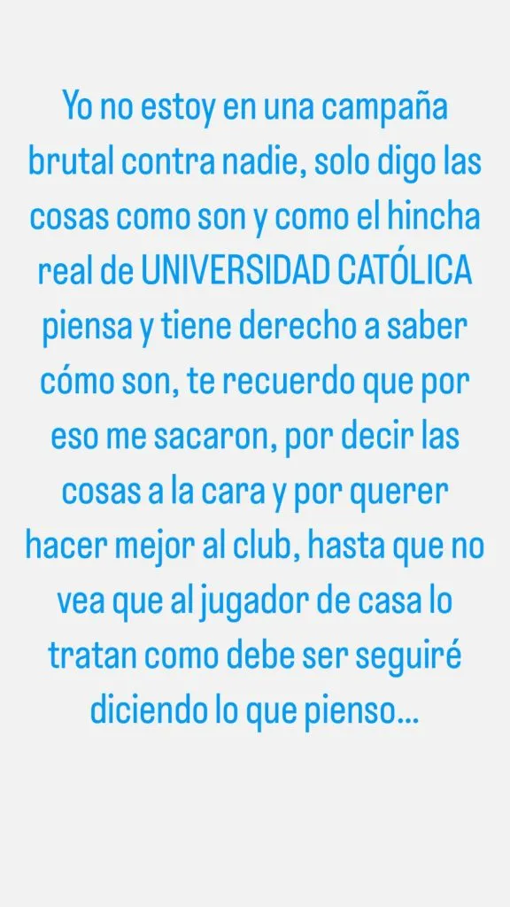 También descartó estar en campaña contra alguien: “Yo no estoy en una campaña brutal contra nadie, solo digo las cosas como son y como el hincha real de Universidad Católica piensa y tiene derecho a saber cómo son. Te recuerdo que por eso me sacaron, por decir las cosas a la cara y querer hacer mejor al club”.