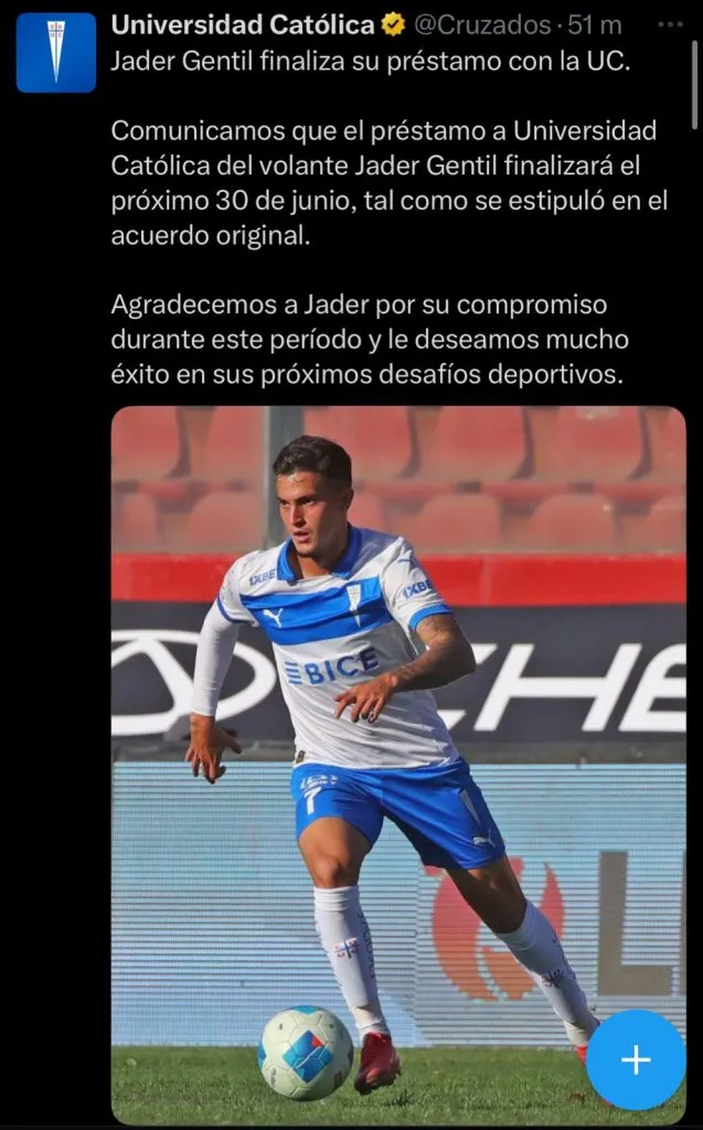 “Jader Gentil finaliza su préstamo con la UC. Comunicamos que el préstamo a Universidad Católica del volante Jader Gentil finalizará el próximo 30 de junio, tal como se estipuló en el acuerdo original”, parten señalando.