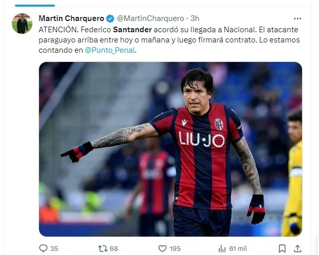 Según informó el periodista uruguayo, Martín Charquero, Nacional se quedó con el atacante paraguayo, Federico Santander, quien será el nuevo refuerzo del conjunto del ‘Bolso’ para este 2024.