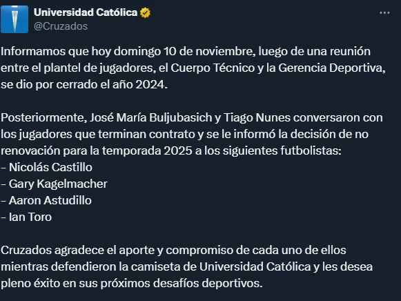 Hace unos instantes, la Universidad Católica dio un detallado informe de lo que fue esta conversación, en la que dio a conocer de los cuatro jugadores que no están contemplados para la temporada 2025