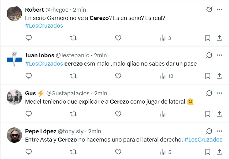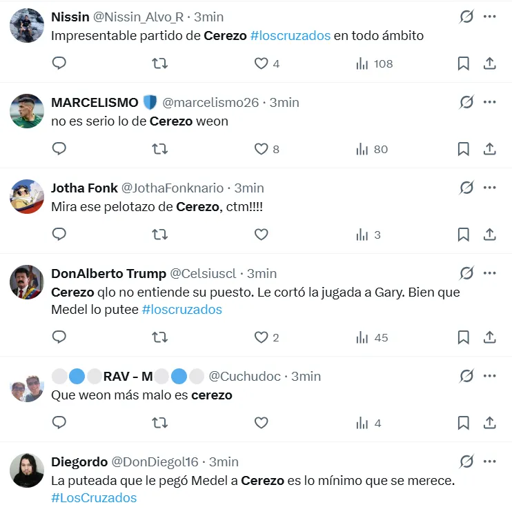 En tanto, Cerezo también recibió durísimos comentarios en su contra: “Medel teniendo que explicarle a Cerezo como jugar de lateral”, y también: “El que trajo y dio el ok a Cerezo se debe ir inmediatamente”.