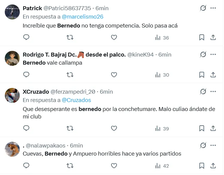 Hacia el meta, se leyeron comentarios bastante ácidos tales como: “Que se lesione de gravedad Bernedo, sería la mejor noticia que podría recibir” o también: “Día 5mil diciendo que Bernedo es malísimo”.