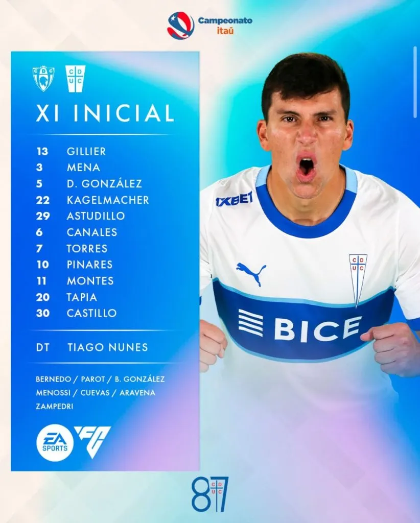 La formación de la Universidad Católica será con: Thomas Gillier en portería; Aaron Astudillo, Daniel González, Gary Kagelmacher y Eugenio Mena en defensa; Alfred Canales, César Pinares, Joaquín Torres y Clemente Montes como volantes; Gonzalo Tapia y Nicolás Castillo en el ataque.