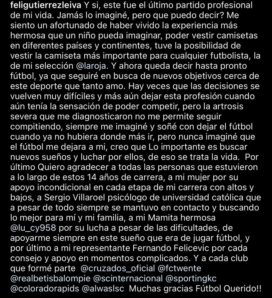 A través de su Instagram, Felipe Gutiérrez entregó el duro anuncio que sorprendió a todos los cruzados y los hinchas de La Roja. “Y sí, este fue el último partido profesional de mi vida. Jamás lo imaginé, pero que puedo decir?”, empezó su escrito.