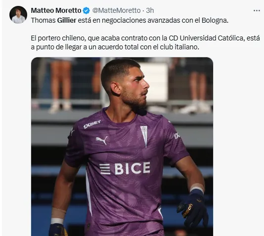 El portero, Thomas Gillier diría adiós a la Universidad Católica, en la que dejaría el club para tener su primer desafío en el extranjero, en la que se transformaría en nuevo jugador del Bologna de Italia.