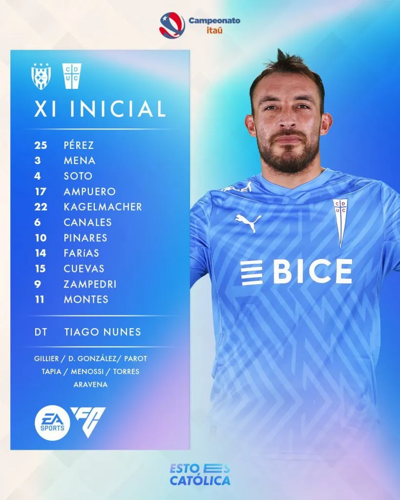 La formación de la Universidad Católica será con: Sebastián Pérez en portería; Guillermo Soto, Branco Ampuero, Gary Kagelmacher y Eugenio Mena en defensa; Agustín Farías, Alfred Canales y Cristián Cuevas como volantes; César Pinares, Fernando Zampedri y Clemente Montes en el ataque.