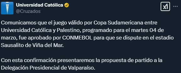 “Comunicamos que el juego válido por Copa Sudamericana entre Universidad Católica y Palestino, programado para el martes 04 de marzo, fue aprobado por CONMEBOL para que se dispute en el estadio Sausalito de Viña del Mar”