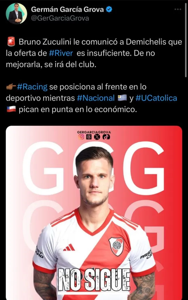 El periodista argentino, Germán García Grova informó en su cuenta de ‘X’ que Zuculini manifestó a River Plate que su oferta para renovar fue insuficiente y que todo daría a indicar, de que el jugador marchará gratis finalizando el 2023.