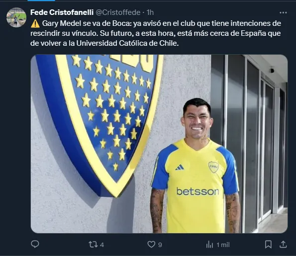 “Gary Medel se va de Boca: ya avisó en el club que tiene intenciones de rescindir su vínculo. Su futuro, a esta hora, está más cerca de España que de volver a la Universidad Católica de Chile”, declaró.