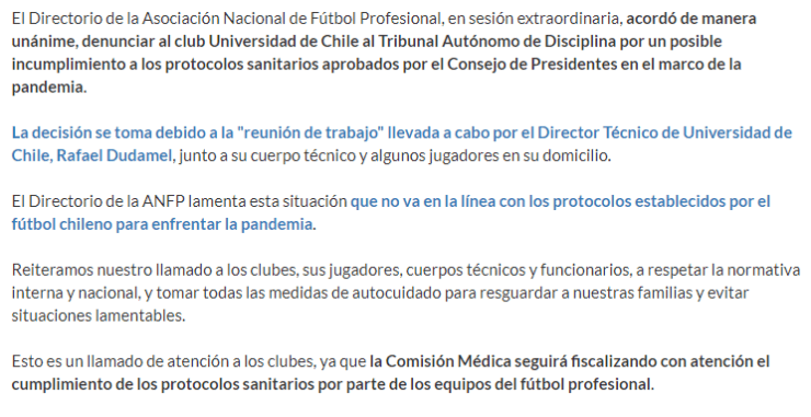 Es producto de esta situación que la Asociación Nacional de Fútbol Profesional (ANFP) emitió un comunicado al respecto, señalando que denunciarán a la institución ante los Tribunales de Disciplinas por el incumplimiento de protocolos sanitarios.