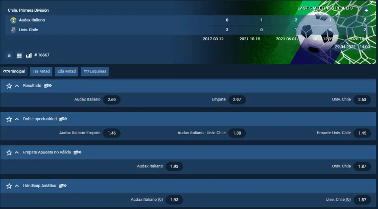 Para Juégalo, el favorito para ganar en este partido pendiente de la fecha 11 del Campeonato Nacional es Universidad de Chile, que paga 2,63 veces lo que juegues, por sobre los 2,69 que paga Audax Italiano, si crees que los itálicos se quedan con el partido. Ahora, el empate entre ambos elencos paga 2,97 veces lo que juegues.