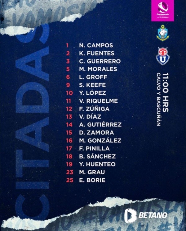 Además de la Jefa fueron convocadas Natalia Campos, Emelie Borie, Fernanda Zúñiga, Mariana Morales, Fernanda Pinilla, Valentina Díaz, Monserratt González, Karen Fuentes, Llanka Groff, Ana Gutiérrez, Yessenia López, Monserrat Grau, Yessenia Huenteo, Daniela Zamora, Bárbara Sánchez, Sonya Keefe y Verónica Riquelme.