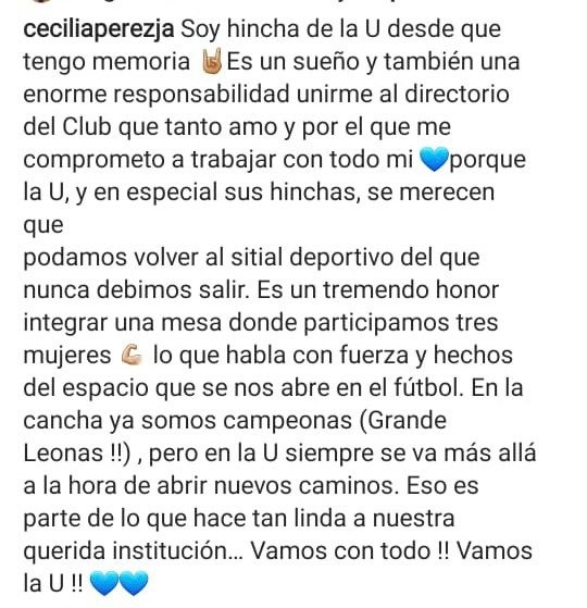 Es un tremendo honor integrar una mesa donde participamos tres mujeres, lo que habla con fuerza y hechos del espacio que se nos abre en el futbol. En la cancha ya somos campeonas, pero en la U siempre se va más allá a la hora de abrir nuevos caminos. Eso es parte de lo que hace tan linda a nuestra querida institución. Vamos con todo, vamos la U”, finalizó en su posteo.