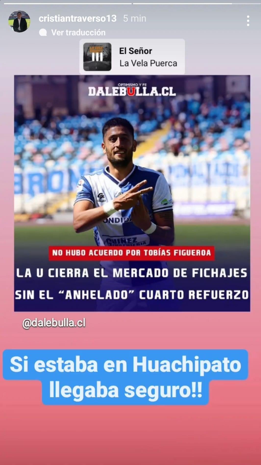 Desde Argentina, Traverso dio a conocer su molestia. “Si estaba en Huachipato llegaba seguro”, remarcó el ex defensor central y volante ensu cuenta de Instagram.