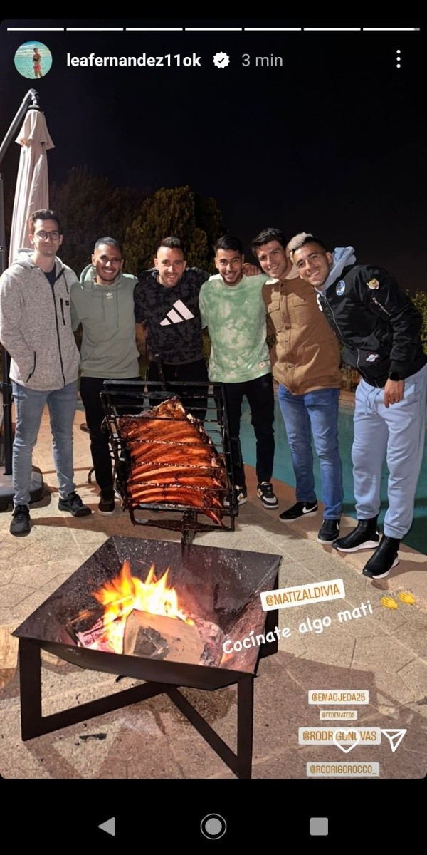 Fue el delantero argentino, quien publicó una fotografía en su cuenta en Instagram con todos sus compañeros y dos amigos más, mientras se ve el brasero y cómo se va asando el corte que compartieron minutos más tarde. “Cocinate algo, Mati” (léase como argentino) , fue lo que escribió el ex Independiente mientras inmortalizaron el momento.
