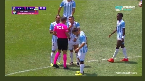 Fue por los reclamos que recibió tarjeta amarilla de parte del debutante juez del partido, quien ya tenía advertido al jugador de Magallanes.