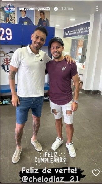 Pero en este amistoso hubo una situaciónque llamó la atención de los hinchas del Romántico Viajero. Y es que eldefensor central Nery Domínguez se tomó un minuto para publicar una fotografía en su cuenta de Instagram, en la cual se le ve acompañado del ex seleccionadoal interior del camarín azul.