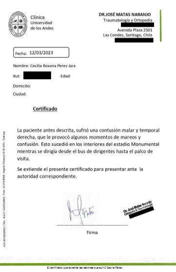 “La paciente antes descrita, sufrió una contusión malar y temporal derecha, que le provocó algunos momentos de mareos y confusión. Esto sucedió en los interiores del estadio Monumental mientras se dirigía desde el bus de dirigentes hasta el palco de visita”, aseveró el certificado firmado por el médico José Matas Naranjo.