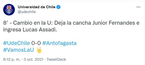 Universidad de Chile no lograba tener un buen arranque en el partido producto de que las lesiones se hacían presente en el plantel azul. Junior Fernandes solo estuvo siete minutos en cancha desde el arranque del enfrentamiento, ya que, debió salir por lesión.