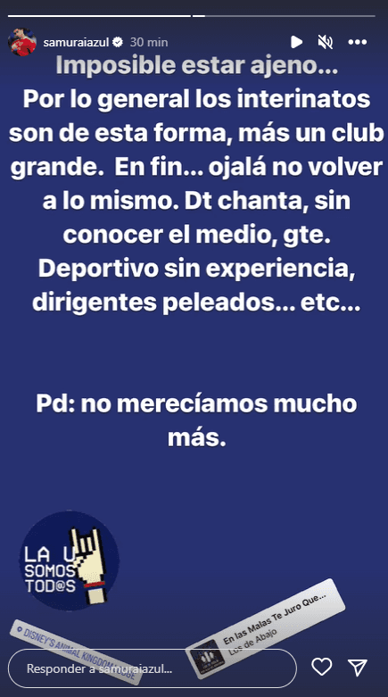 Agregando que “en fin, ojalá no volver a lo mismo. DT chanta, sin conocer el medio, gerente deportivo sin experiencia, dirigentes peleados, etcétera”, siguió.