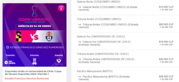 Las entradas ya se pusieron a la venta al menos para el primer encuentro de la U ante los anfitriones a través del sistema Ticketplus. los valores fluctuan en 30 mil pesos Tribuna Pacífico, 20 mil tribuna andes y 10 mil pesos la galería. El sector sur del recinto coquimbano es el designado para hinchas de la U.