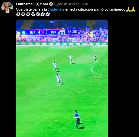 A través de redes sociales, uno que sufrió viendo el descalabro azul fue Marco Antonio Figueroa: “qué triste ver a la Universidad de Chile en esta situación. Ánimo bullangueros”, lamentó el Fantasma en su cuenta de Twitter junto a un pantallazo del 4-0.