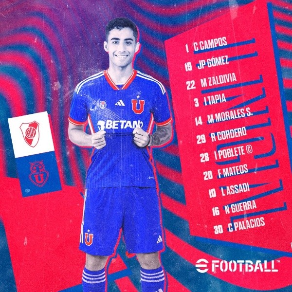 Con todo esto ya consignado, la formación de la U para medirse ante los millonarios es con Cristóbal Campos Véliz en el arco; Juan Pablo Gómez, Matías Zaldivia, Ignacio Tapia y Marcelo Morales; Renato Cordero, Federico Mateos, Israel Poblete y Lucas Assadi; Nicolás Guerra y Cristian Palacios.