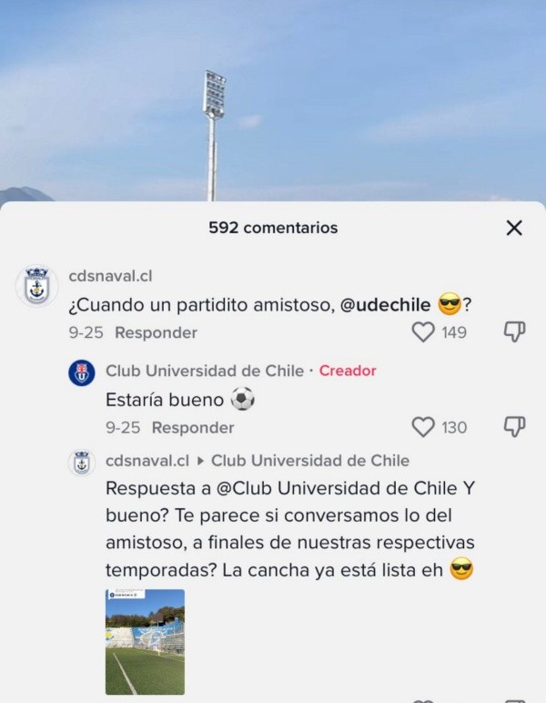 Pues bien, usando la red social Tik Tok el día 25 de septiembre, en el cuadro navalino se publica un video con imagen del estadio y en la leyenda preguntan “¿Cuándo un partidito amistoso, Universidad de Chile?” Acto seguido en la U respondieron con un “Estaría bueno”.