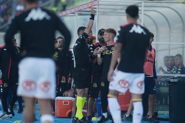 Minutos después, casi al final del partido en el 82′, ocurrió una acción similar y Véjar volvió a mostrar la tarjeta equivalente a la expulsión, ya que el pelotero azul también volvió a retrasarse a la hora de pasar el esférico que favorecía a la Unión Española.