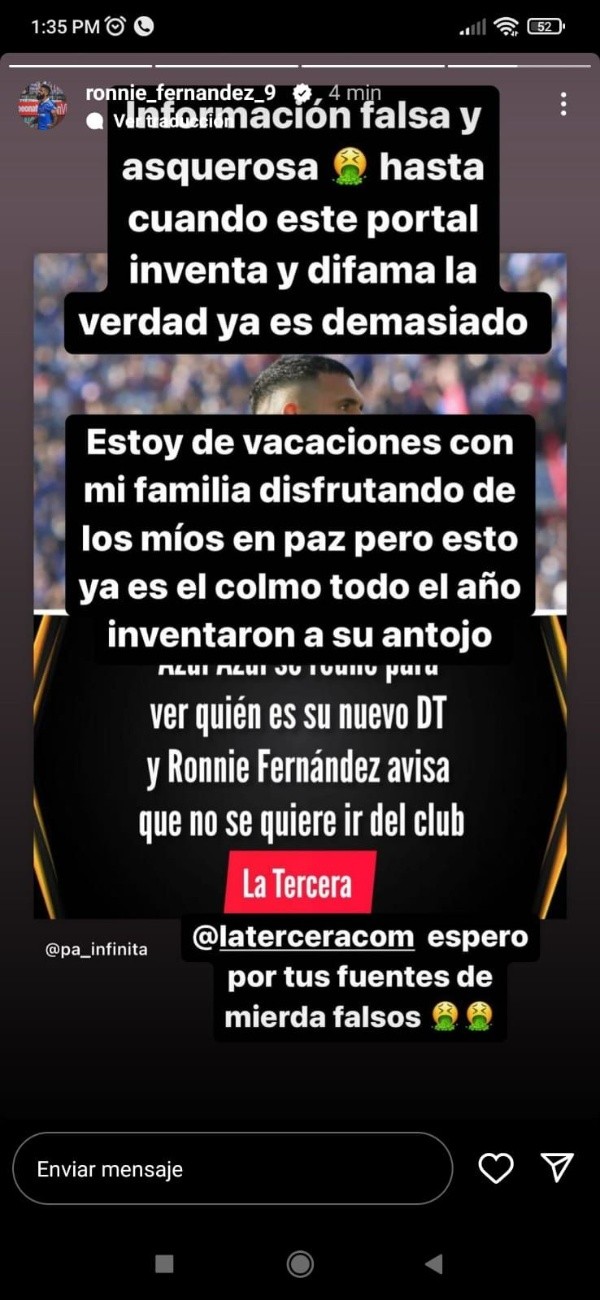 La molestia del ex Santiago Wanderers finaliza apuntando a Diario La Tercera, “espero por tus fuentes de mierda, falsos” y acompañado de emoticones vinculados a gestos de repugnancia.