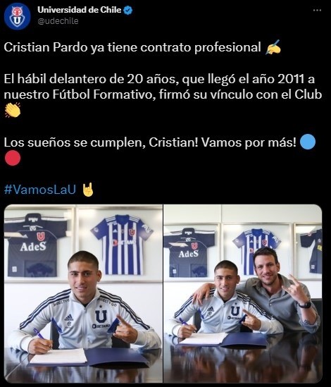 “Cristian Pardo ya tiene contrato profesional. El hábil delantero de 20 años, que llegó el año 2011 a nuestro Fútbol Formativo, firmó su vínculo con el Club. Los sueños se cumplen, Cristian!. Vamos por más!”, dictaba el comunicado en las redes sociales de los azules. Más tarde, el futbolista posteó en sus redes “agradecido de Dios” con él en la imagen.